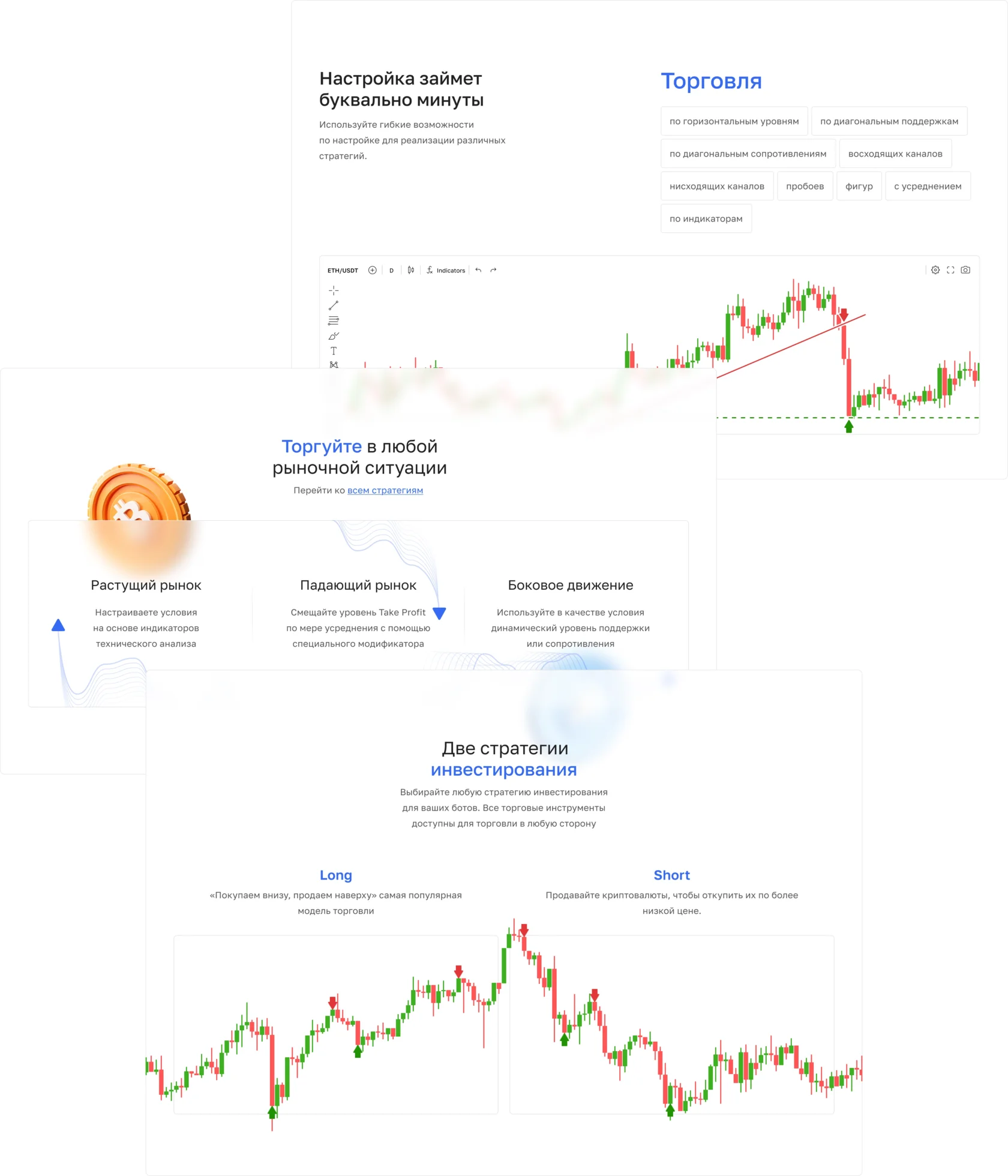 Блок раскрывает, как продукт работает в разных рыночных условиях. Пользователь видит, что сервис применим не к одному кейсу, а адаптируется под рост, падение и боковое движение рынка.