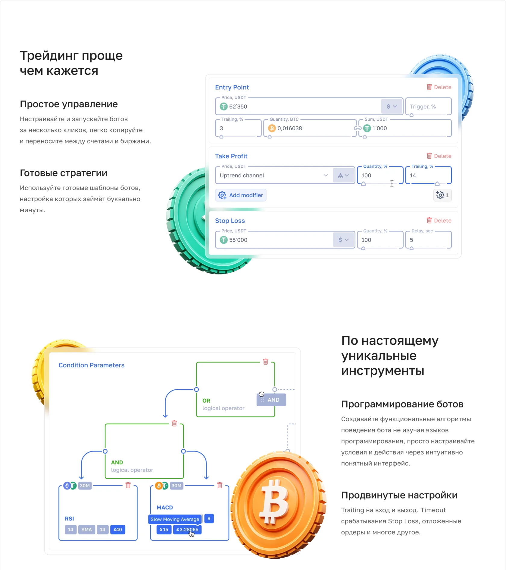 Продвинутые настройки и отсутствие ограничений позволяют реализовывать сложные сценарии, сохраняя контроль над каждой сделкой. Это делает продукт универсальным — как для начинающих, так и для опытных трейдеров.