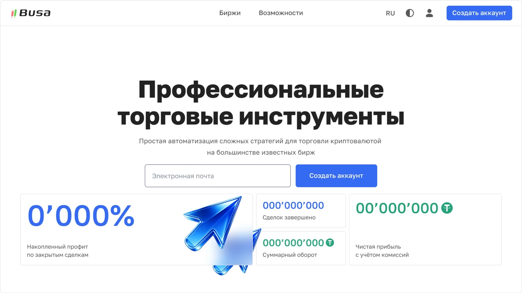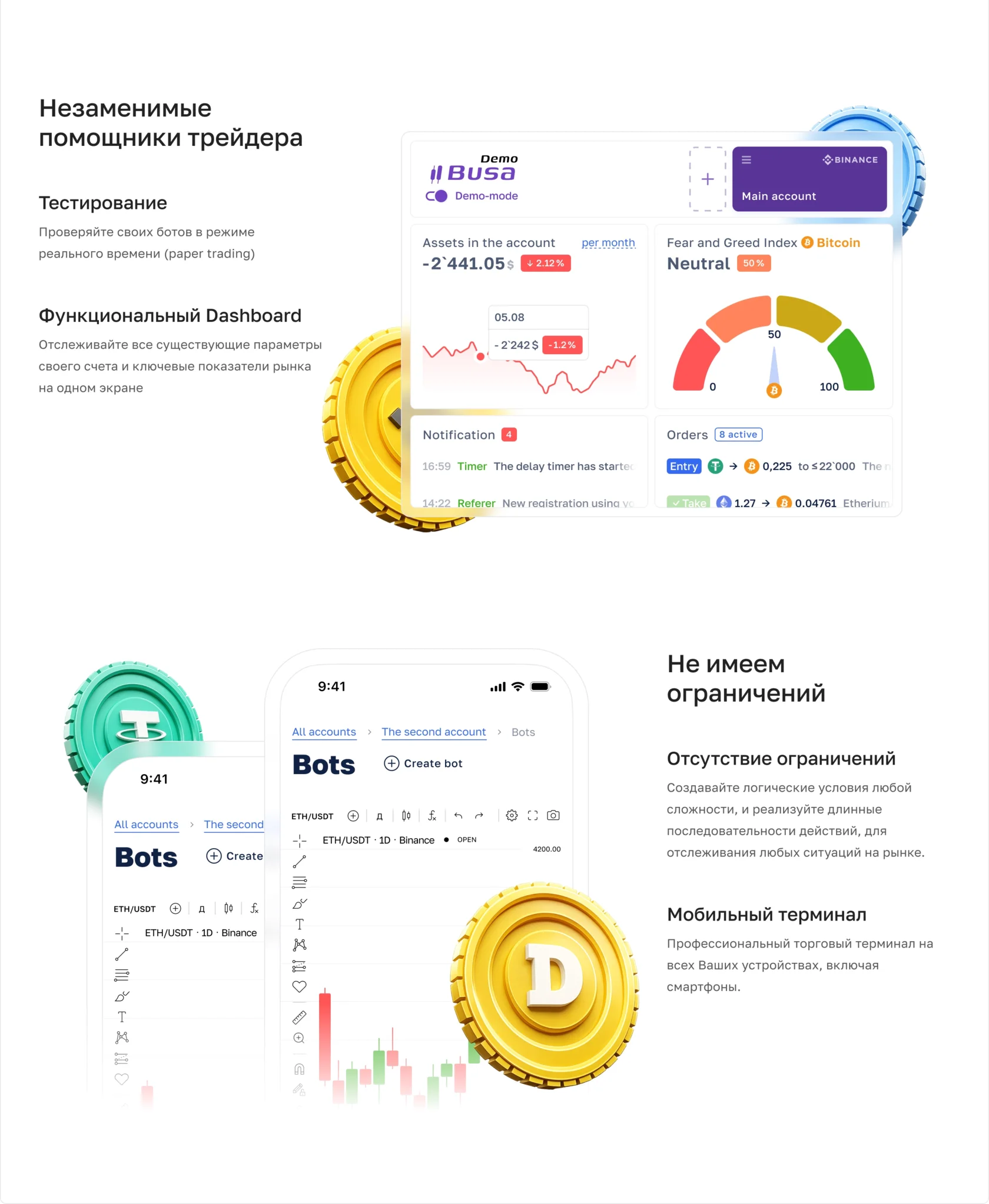 Busa — это сервис автоматической торговли криптовалютой через настраиваемых ботов. Пользователь задаёт условия и триггеры, а система круглосуточно отслеживает рынок и исполняет сделки без его участия.