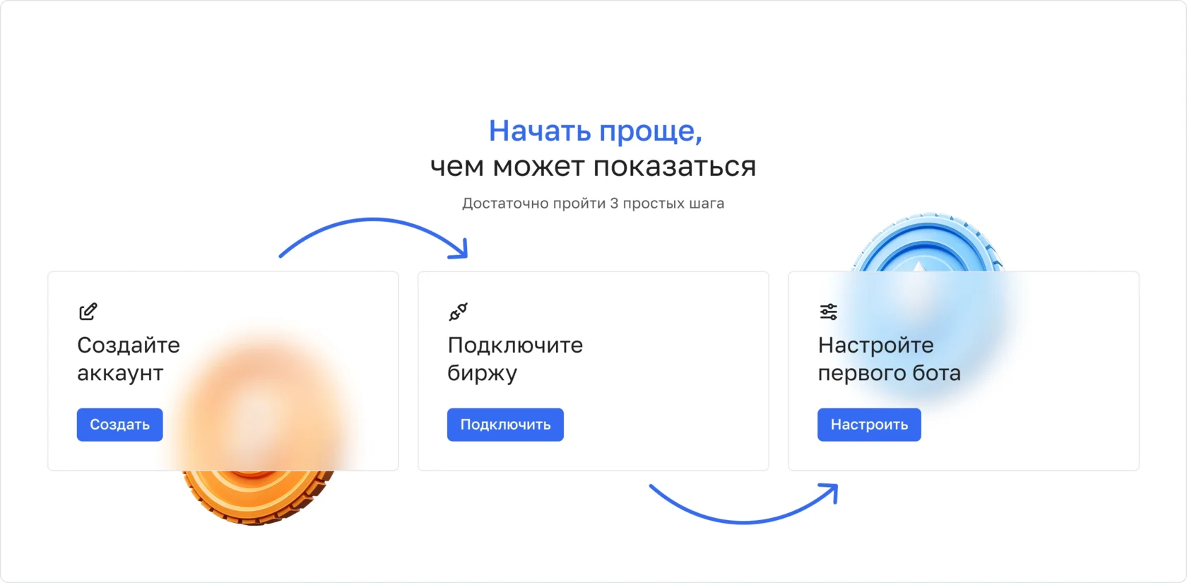 Структура из трёх шагов убирает ощущение сложности и подводит к действию. Регистрация становится логичным продолжением сценария, а не отдельным усилием.