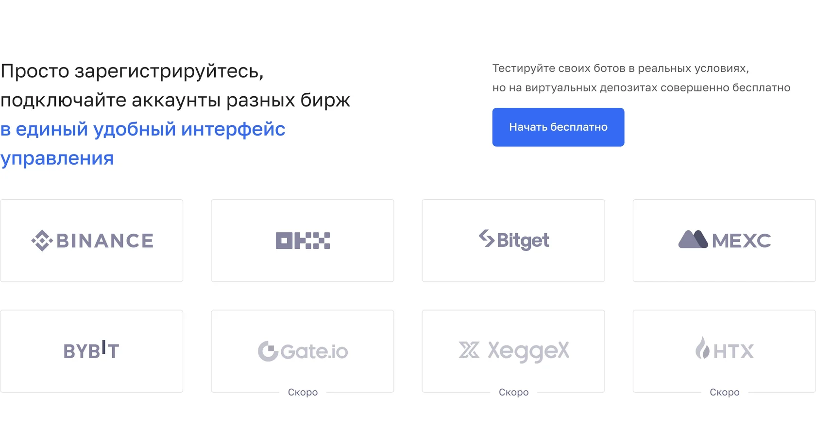 Блок показывает, с чем работает сервис и как он встраивается в реальную торговлю. Пользователь может подключить аккаунты разных бирж и управлять ими в одном интерфейсе, без переключения между платформами.