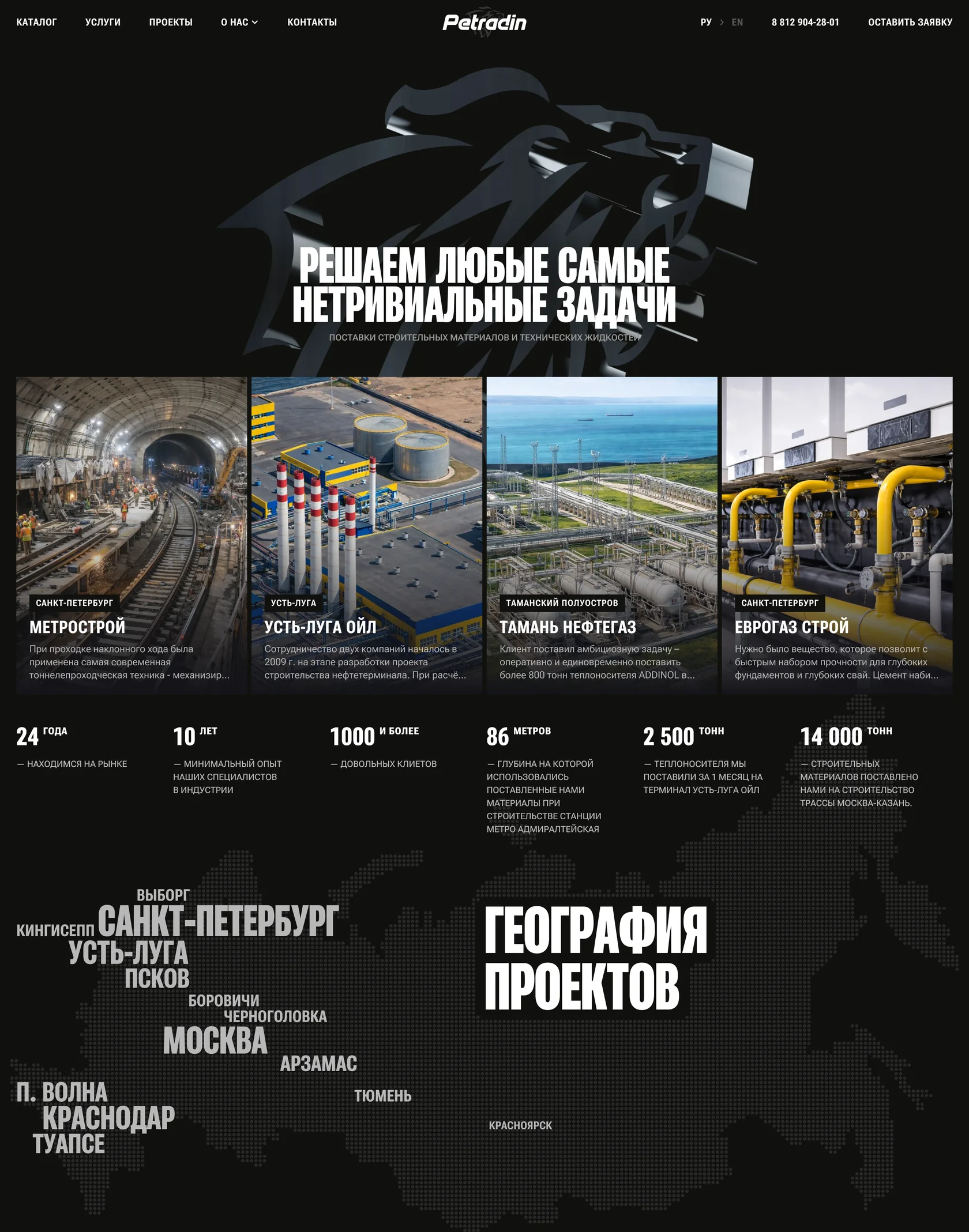 Контент выстроен последовательно: проекты, география, каталог и услуги. Пользователь без лишних действий переходит к нужному разделу и понимает масштаб компании.