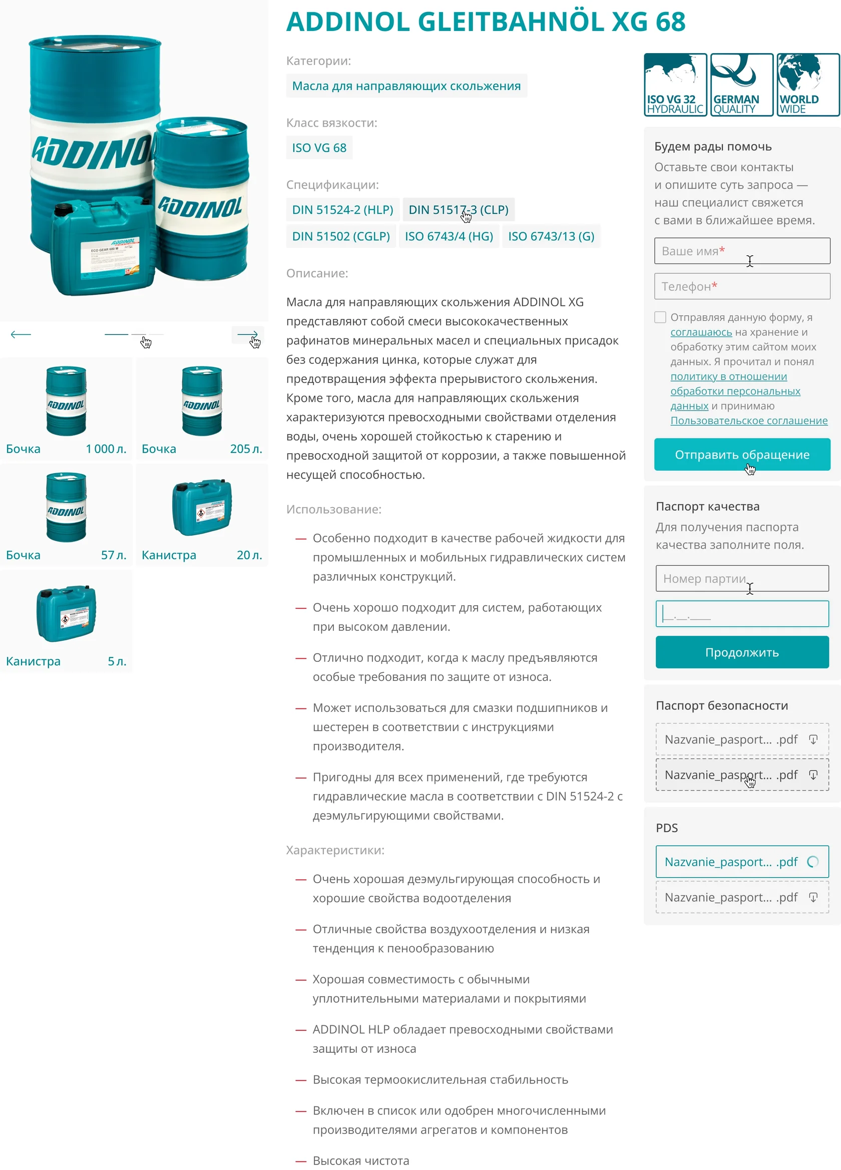 Ключевые характеристики вынесены в начало: категория, вязкость, спецификации. Они оформлены в виде кликабельных бейджей — любой из них можно нажать и сразу вернуться в каталог с примененным фильтром.