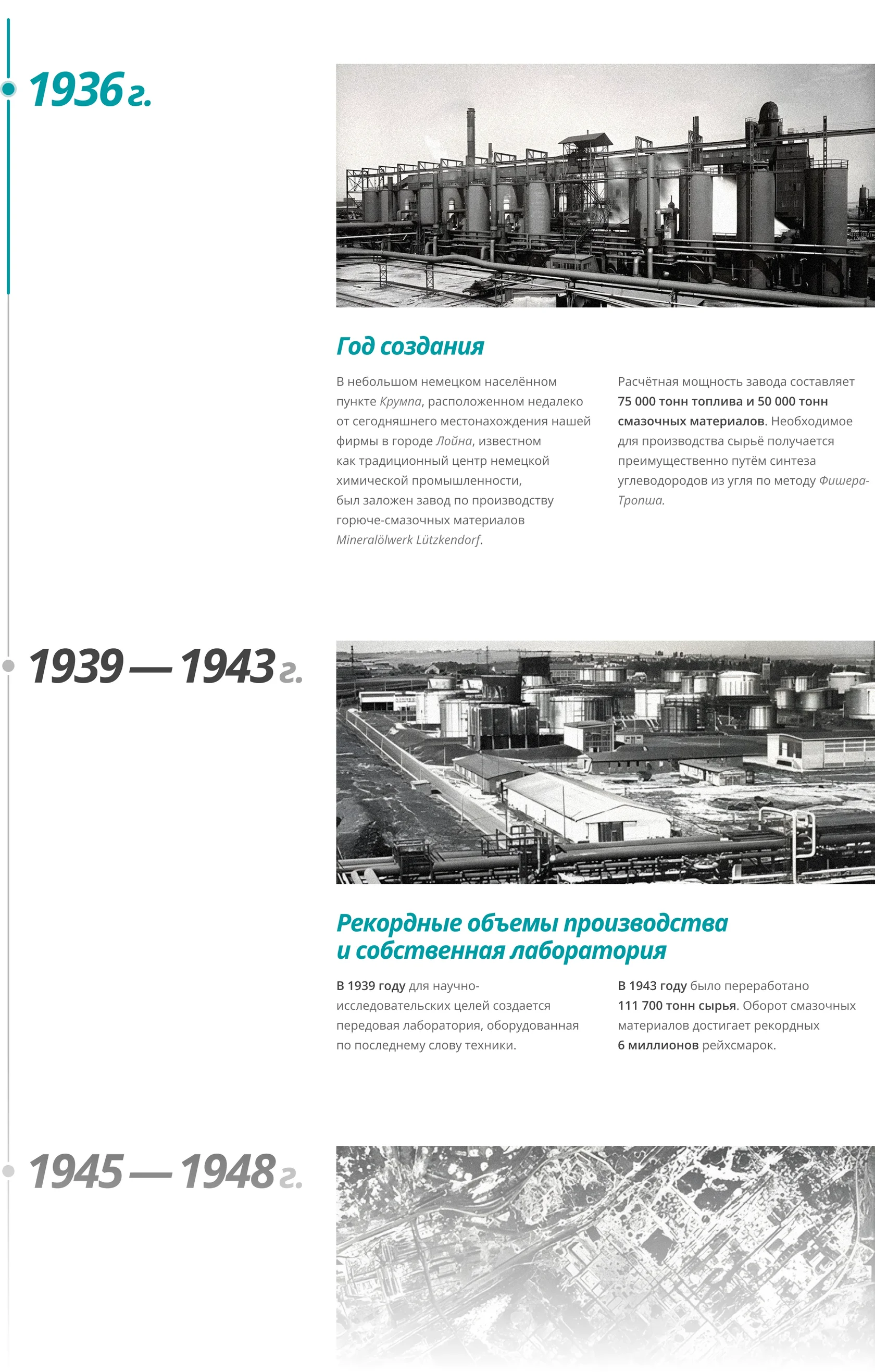 Контент оформлен в виде вертикального таймлайна с фиксацией ключевых годов. Годы остаются в поле зрения при скролле, помогая удерживать контекст и не теряться в большом объеме информации.