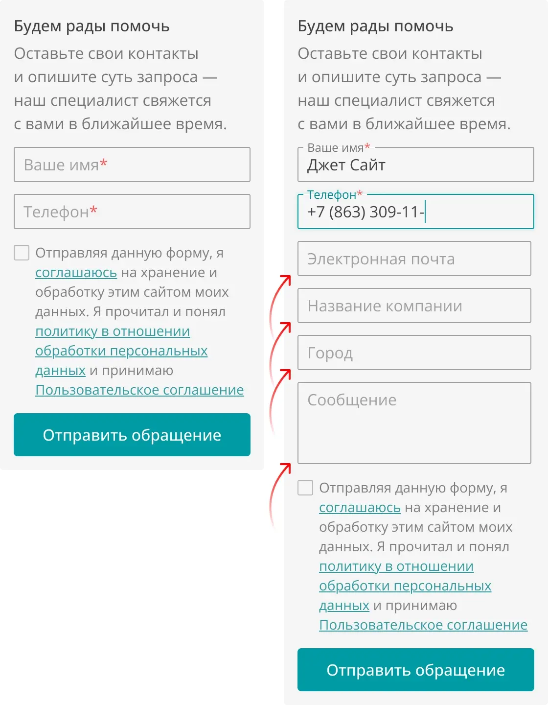Форма обратной связи спроектирована так, чтобы снизить барьер входа. Вместо длинного списка полей пользователь сначала видит только базовые: имя и телефон.